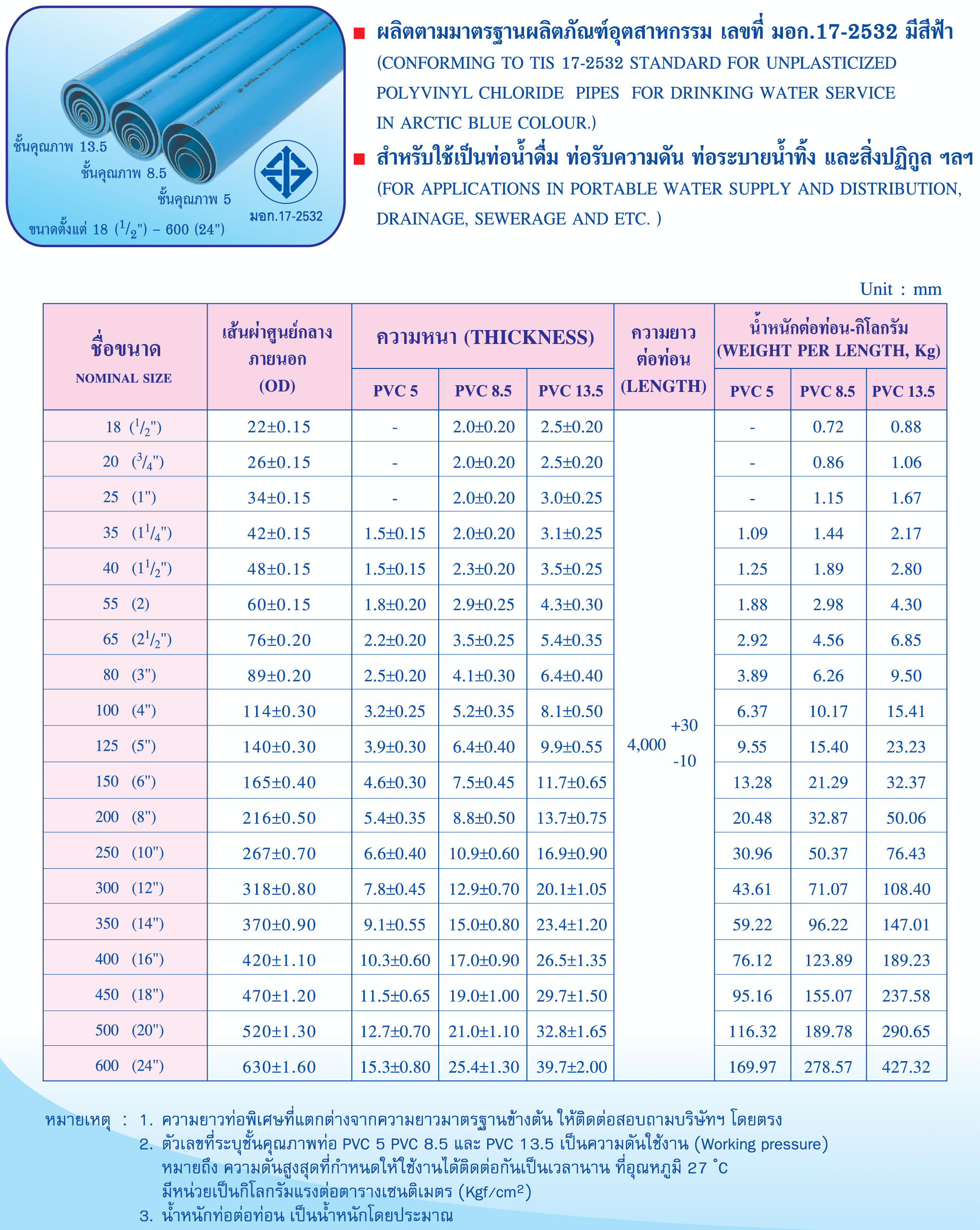 ท่อพีวีซีแข็งสำหรับใช้เป็นท่อน้ำดื่ม แบบท่อปลายธรรมดา uPVC PIPE DRINKING WATER SERVICE WITH BOTH BOTH PLAIN END